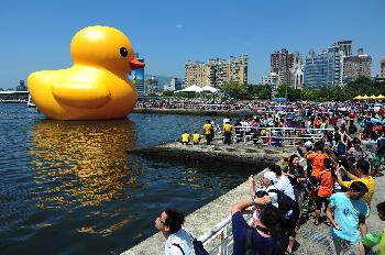 正在高雄光榮碼頭展出的黃色巨鴨,19日吸引約20萬人觀賞,20日依然有大批賞鴨者。但因天兔來襲,高雄市政府20日午把黃鴨吊上陸地放氣,要待天兔離去再放黃鴨出來。有遊客說想趁黃鴨放氣前來見“最後一面”,搶拍黃鴨風采。(香港明報)