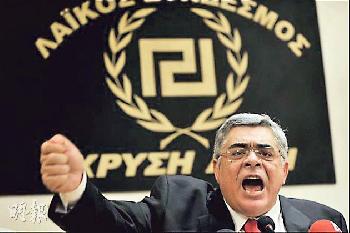 (希臘)金色黎明黨否認奉行新納粹主義,黨徽與納粹標誌極相似,黨魁馬哈洛里亞科斯(Nikolaos Michaloliakos)亦愛納粹式敬禮,並否認曾有猶太人大屠殺,部份資深黨員曾公開讚揚希特勒。