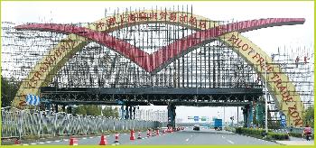 上海外高橋保稅區旁的主要幹道上,原本寫著“外高橋保稅區”的黃色拱門,已換上“中國(上海)自由貿易試驗區”字樣。(圖:香港明報)
