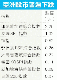 (印尼)投資者對聯儲局的買債政策感到困惑,市場再次憂慮令亞洲股市昨普遍走軟。部份新興經濟體自聯儲局5月放風“收水”以來資金嚴重外流,印尼盾兌美元昨曾跌至11,586水平,是2009年4月以來低位,今年來累積跌16%。
