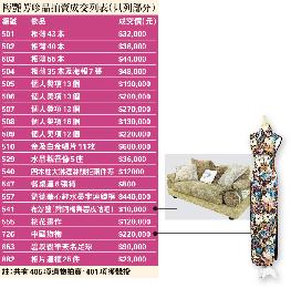 (香港)梅艷芳逾千件遺物昨日在拍賣行舉行“芳華再現梅艷芳服飾及珍品拍賣”,經過長達8小時的競投,401項成交,總成交價5,310,100元,包括擺放在故居的傢俱、歌服、金唱片、獎座等。曾志偉聯同張學友、苗僑偉等人透過歌迷會名義,成功以101萬元投得阿梅67座獎座。志偉說:“獎座是藝人的尊嚴,絕不可以流落在外面。”尚有11枚阿梅的白金與金唱片被歌迷林先生以60萬元投得,成為全日最高成交價的拍賣品。