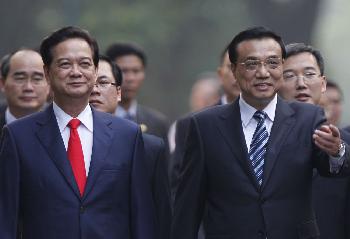 (越南)國務院總理李克強昨日(13日)中午乘專機抵達河內,開始對越南進行正式訪問。李克強昨日下午與越南總理阮晉勇會談時說,中越共識和共同利益遠大於分歧,要“努力創新思維,破解南海這一兩國關係中唯一的歷史遺留問題”。雙方同意成立海上、陸上、金融三個聯合工作組,並於年內啟動工作,當中海上工作組將商議北部灣灣口外海域的共同開發。