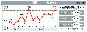 (中國)中國最新公佈的消費物價指數(CPI)重回“3.0時代”,引起高通脹重臨的關注和憂慮。國家統計局昨日公佈,9月份CPI錄得較去年同期上升3.1%的增幅,是過去7個月以來最高。其中食品價格上升6.1%,更創下今年新高,據稱主因是颱風帶來的損失以及季節性因素致食品價格上升。