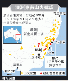 (澳洲)澳洲最大城市悉尼市郊發生近10年來最嚴重山火,多達100個火頭肆虐,波及9.1萬公頃土地,有數以百計房屋被毀,造成最少1人死亡。山火至今未有緩解跡象,上千名居民被安置到疏散中心暫避。