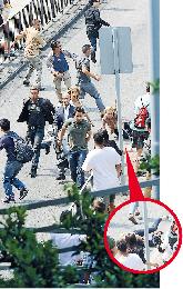 滿面披血的麥克華堡帶頭跟泰迪斯韋利華、積雷諾、妮歌娜佩斯在大逃亡;隨後的蘇菲亞邁亞斯失平衝跌倒在地。 (圖:香港明報)