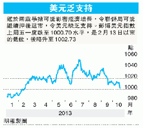 Natixis估計今次政府關門,將拖低美國經濟增長0.3個百分點,並以此為基礎,將第四季增長預期,由2.2%下調至1.9%。押後至本週二公佈的上月就業數據倘令人失望,可能令美元進一步下跌。分析員預測9月美國失業率維持在7.3%,非農業新增職位18萬個。