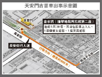 據北京警方通報,昨午12時許,“一輛吉普車由北京市南池子南口闖入長安街便道,由東向西行駛撞向天安門金水橋護欄後起火,行駛過程中造成多名遊客及執勤民警受傷”。據現場網友透露,該車先衝向人群,再撞上華表,路透社更引述目擊者稱,車輛起火前聽見爆炸聲。從現場圖片可見,吉普車燃起熊熊烈火,濃煙冲天,廣場上不少傷者倒地不起,部份外籍遊客還為傷者急救。