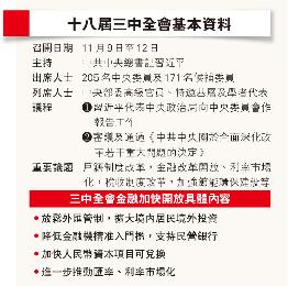 中共中央政治局在週二(29日)宣佈,中共第十八屆中央委員會第三次全體會議於11月9日至12日在北京召開,將審議通過《中共中央關於全面深化改革若干重大問題的決定》。事實上,從1978年以來,每5年一次的三中全會都是中國經濟出現重大轉折的助燃劑,例如1978年定調改革開放,1984年改革由農村走向城市,1993年奠定鄧小平南巡後的改革路線等。