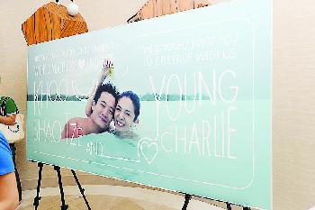 婚宴場外放置了Charlie與邱韶智的戲水照作布景。(圖:香港明報)