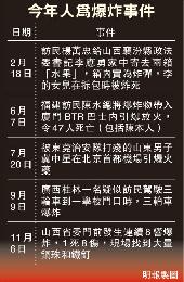 (中國)昨天早上,位於山西省太原市的山西省委大樓門前發生8次連環爆炸,引致1死8傷,公安初步認定事件是人為造成。目前有消息指案件為恐怖襲擊,亦有人稱為訪民所為,但消息均未得到官方證實。事發現場發現不少長鋼釘和鋼珠,相信炸彈製造者是為了帶來更大的殺傷力。