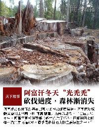 記者日前走訪了一處位於喀布爾東郊的木料市場,首先映入眼簾的就是堆如小山的木塊和不遠處光禿禿的山丘。一個當地小夥子正在掄斧頭,把大塊木料劈成小塊木頭。