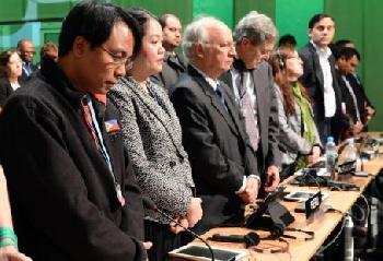 完成發言後,淚流滿面的薩諾贏得了長時間的掌聲。在中國代表團副團長蘇偉的提議下,全場起立為颱風“海燕”的所有遇難者默哀3分鐘。