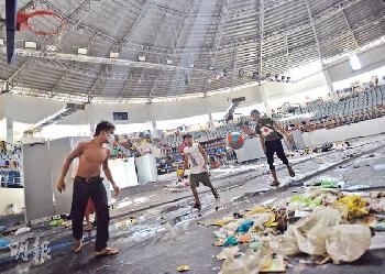 重災區塔克洛班市的體育館被闢作收容中心,館內垃圾堆積如山,災民隨處便溺,臭氣熏天,但有災民戴口罩(左)也要打籃球,自得其樂。(圖:香港明報)