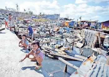 風災過後的塔克洛班市,幾乎看不到完整的建築物,災民缺乏食水供應,有人在地上寫上HELP ME字句,希望儘快獲得救援。