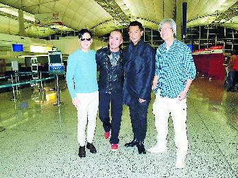 張家輝(左起)、《掃毒》出品人林小明、古天樂及導演陳木勝15日晚啟程赴羅馬。(圖:香港明報)