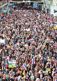 (泰國)泰國爆發3年來最大規模反政府示威,首相英祿面臨上台兩年來最大政治危機。由在野民主黨率領的數以萬計示威者,昨早兵分13路,操往政府機構、軍警總部及電視台,誓言要將塔辛政權連根拔起。示威隊伍昨日先後佔據財政部、外交部及政府公共關係部,並以外交部為大本營。首相英祿則重申不會辭職或解散國會,昨晚又宣佈在大部份曼谷市內以及周邊地區包括機場,實施內部安全法,有需要時可封路和宵禁。消息稱,倘反政府示威者與支持塔辛的紅衫軍爆發衝突,軍方可能出手。