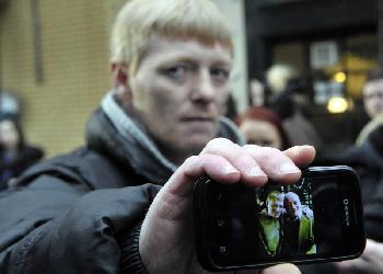 有男子在酒吧外展示手機內與父親的合照,稱父親或已在意外中身亡。(圖:法新社)