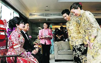 一對新人對於記者多次要兩人接吻的要求有求必應,蔡加讚戴領巾有圓點,新娘子即甜笑說:“他都把我(圓圓)放在身上。”兩人同是27歲踏入人生新階段,所以當天心情只有開心,對於家婆要求他們生6個小朋友,圓圓瞪大眼:“不是吧?”新郎則笑語:“辛苦你了!”他們稍後才會去度蜜月。(香港明報)