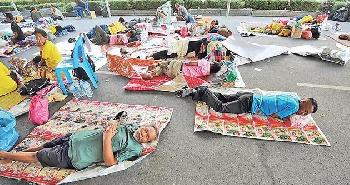 泰國部分反政府示威者昨在民主紀念碑附近休息。(圖:法新社)