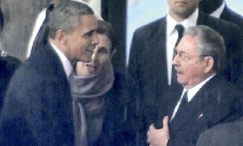 奧巴馬車隊因雨勢而延誤,遲了到場。主持人介紹奧巴馬時,稱他是“非洲大地之子”,他也成為追思會一大焦點。他在上台演說之前,主動走向與古巴領導人勞爾‧卡斯特羅(Raul Castro)握手“融冰”。古巴政府昨晚在網站發佈握手照片,圖片說明稱:“奧巴馬向勞爾打招呼:希望這張圖片是美國停止攻擊古巴的起步。”這是過去60年來這兩個冷戰時期敵國的領袖第二次握手。2000年千禧年高峰會在紐約舉行時,當時的古巴領導人卡斯特羅也曾和美國總統克林頓握手致意。