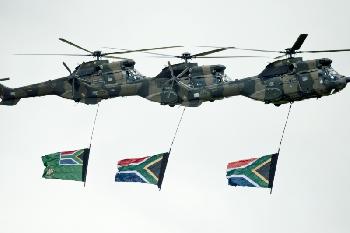 軍用直升機15日吊掛軍方旗幟(左)和南非國旗,飛越喪禮會場上空,向曼德拉致敬。(圖:法新社)