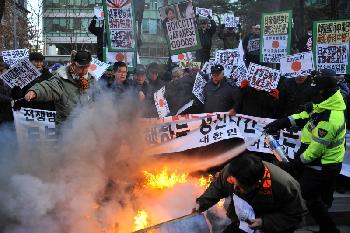 韓國首爾27日有示威者抗議日本首相安倍晉三參拜靖國神社,焚燒安倍假人泄憤,保安人員(右)將火撲滅。(圖:法新社)