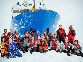 受困的“紹卡利斯基院士”號人員,28日離開船艙在船邊拍照留念,各人神情均甚愉快。(圖:法新社)