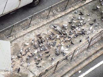 (香港)禽流感陰霾下,香港多個黑點仍見大批野鴿,傳播病毒風險不容忽視。其中長沙灣東京街,每天有過百隻野鴿覓食,有居民從高空觀察半年,發現有數名市民經常放下大批食物餵鴿,其中一名婦人更採取“新招”,將麵包拋上港鐵站出口頂部,難為清潔工要爬梯清潔。港鐵曾採取多種方式趕鴿,包括吊起光碟,又設蜂鳴器,記者到現場觀察,發現附近的建築物花槽及天橋邊都有鳥糞,清潔工人須每天清洗。附近居民曾多次向食環署投訴,情至今仍未改善。