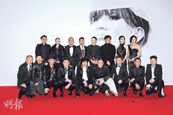 (前排左起)曾志偉、張學友、杜德偉、梁漢文、蔡一智、蘇永康、蘇志威、劉德華、蔡一傑、(後排左起)陳奕迅、關淑怡、梁朝偉、郭富城、劉嘉玲、成龍、楊千嬅、何韻詩一起為梅艷芳送上遙遠的思念。(圖:香港明報)