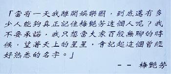 劉德華演唱時熱淚盈眶,他表示比下午綵排時,情緒已平靜了一點。對於何超儀建議爭取為阿梅立紀念銅像,華仔認為是好事,但無論是否成功,阿梅在大家心目中的地位亦不會變。(香港明報)