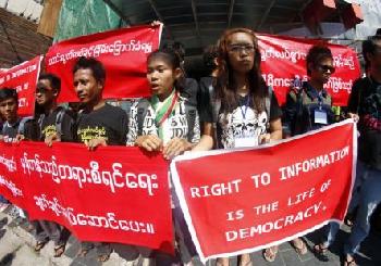 近60名示威記者們身穿黑色T-恤,高喊“我們不要新聞自由受到威脅”的口號,並手持寫著“新聞自由是民主的生命”的標語,在仰光市中心的繁忙街道遊行,抗議《11日報》記者馬凱恩被判監禁3個月。