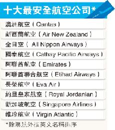 航空公司評鑑網站AirlineRatings.com公佈2013年全球最安全航空公司排名,澳洲航空排第1位,香港國泰、新加坡航空與台灣長榮船空名列前十,美國與中國大陸的航空公司均榜上無名。