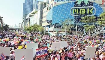 曼谷市中心大型購物中心世貿百貨門外,昨早已有數萬名反政府示威者佔據廣場空地。示威者昨封鎖市內8個重要建築物、7個主要交通路口(見圖)。整個曼谷交通陷入癱瘓,400所學校停課,上百萬居民的生活工作受影響,很多居民選擇乘坐天鐵捷運或地鐵上班,有的決定請假留家,亦有公司甚至索性放假。Twitter和facebook上網民紛紛上傳封城照片,有大量民眾投訴封城帶來不便。泰國機場昨向出租車發放約6000個特殊通行標貼,以提醒示威者這輛出租車內載有乘客,希望能夠暢通放行。