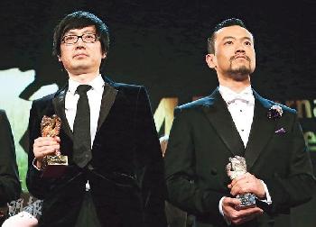 《白日焰火》連奪最佳電影及男主角獎,導演刁亦男(左)與出爐影帝廖凡(右)致謝時均有提及監製文晏,相信後者為集資出力不少。 (圖:香港明報)