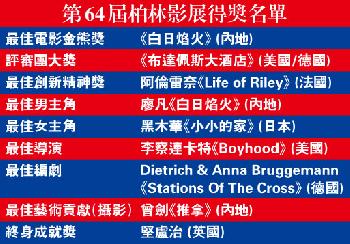 (德國)第64屆柏林影展昨日凌晨舉行頒獎禮,近年遭國際影展冷待的華語片,終於在柏林迎來溫暖的春天,中國導演刁亦男作品《白日焰火》勇奪最佳電影金熊獎之餘,廖凡亦從評審兼《花樣年華》康城影帝梁朝偉手上,接過最佳男主角銀熊獎,榮膺中國首位柏林影帝,極具意義。婁燁執導的《推拿》獲頒最佳藝術貢獻(攝影)獎,可謂收穫甚豐。
