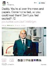 有疑是機長(圖中照片)的女兒昨在Twitter上連發多個信息,又上傳與機長Zaharie Ahmad Shah的合照等,希望父親盡快回家,其中一篇(圖)祝願父親能回來細閱各大報章有關他的報道。