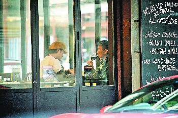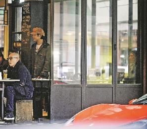 杜德偉離開餐廳時遇上導演林超賢(左),也寒喧兩句。((圖:香港明報)
