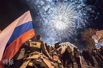 克里米亞上週五正式入俄,首府辛菲羅波爾大放煙花慶祝,有民眾帶著俄羅斯國旗到街頭觀賞。(圖:法新社)