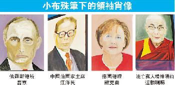 (美國)美國前總統小布什退休後醉心繪畫,出自其手筆的20多幅世界領袖肖像畫作,昨日起在得州達拉斯的小布什總統圖書館和博物館展出,當中包括他任內打交道者,有中國前國家主席江澤民、英國前首相布萊爾和俄羅斯總統普汀等。