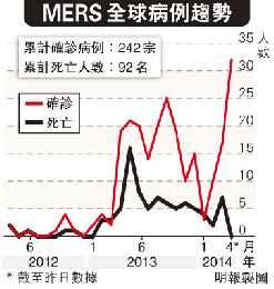 中東呼吸綜合症自2012年9月首次出現確診病例以來,截至昨日,全球累計確診病例已達242宗,死亡人數為92人。本月至今已有32宗新增確診病例,較以往兩年的單月全月新增病例都要多。其中沙地近期確診病例急增,上週首4天內通報的確診個案已達15宗,當中兩人死亡。該國第二大城市吉達(Jeddah)上週六證實有8宗確診病例,包括5名醫護人員,另有一名45歲外國男子死亡。目前沙地累計感染人數達189人,佔總數近八成。不過,該國衛生部長拉比阿(Abdullah al Rabeea)堅稱,數字仍屬“正常”水平。