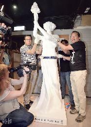 女神像昨晨由支聯會搬到尖沙嘴富好中心的六四紀念館組裝,其腰部及頭髮有石膏剝落,由製作人員即場修補。