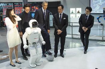 奧巴馬(中)昨在東京的日本科學未來館,腳踩足球準備與本田的機械人“ASIMO”切磋球技。(圖:法新社)