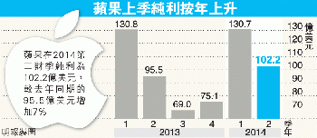 截至3月29日的2014第二財季,蘋果收入較去年同期升4.7%至456億美元,勝市場預期。庫克稱,所有機型都銷售強勁,且新興市場需求旺盛。強勁的銷售帶動蘋果上季毛利率升至39.3%,上年同期為37.5%。不過近幾季的收入和純利增長已有所放緩。(香港明報)