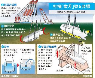 韓國海洋水產部和仁川海洋警察所等昨稱,當局曾要求擴建的“歲月”號將船舶重心(VCG)提高51厘米至11.78米,並增加注入平衡水,由1023噸增至2030噸,以及減少負載,包括貨運由2437噸減至987噸,客運則由88噸減至83噸。