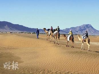 柏柏人領著一隊遊客騎駱駝穿越沙丘,是撒哈拉的現代風情畫。(圖:香港明報)