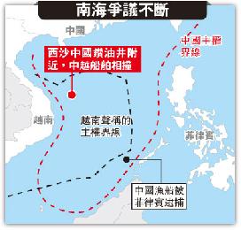 (中國)中越兩國執法船舶近日在南海西沙群島中建島海域對峙,越方指雙方船舶至少3次碰撞,中方用水炮射向越南船,造成人員受傷。中越爭議源於上週六(3日)起中國在西沙海域開採石油,越方指此海域為越南專屬經濟區,中方行為非法,但中國堅稱擁西沙群島主權。美國介入事件,指中方行動“具挑釁性”。有中國學者稱,事件令中越關係陷入自1988年南沙海戰以來最緊張時期,更可能將越南推向美國。