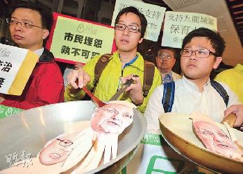 民協約10名成員昨在港鐵股東大會前,攜同鑊及貼有韋達誠及錢果豐肖像的兩條紙板“魷魚”,寓意港鐵要就港鐵醜聞“炒二人魷魚”。(圖:香港明報)