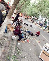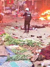 發生恐怖襲擊爆炸的烏魯木齊公園北街文化宮早市,以販賣蔬菜、鮮花和雜貨為主,逛早市者以老年人居多。圖為爆炸發生後,警方進入現場調查,兩名死傷者躺在地上,不遠處火光熊熊。(網上圖片)