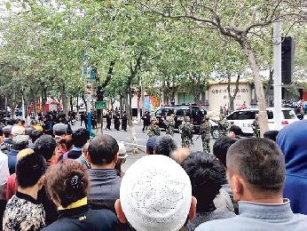 烏魯木齊市沙依巴克區公園北街早市昨晨發生恐怖襲擊爆炸案,造成31人死94傷。圖為恐襲後,市民圍觀警方清理現場。(圖:中國中新社)