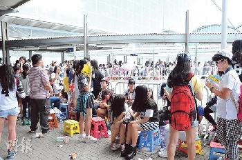 雖然昨日天氣酷熱,但粉絲為見偶像做足準備,除雨傘、扇外,還將退熱貼貼在額頭降溫;當然少不了粉絲近期慣用的“十大武器”之首的摺櫈,可以企高看清楚偶像。主辦單位安排30名保安護送,當成員於12時45分陸續步出時,粉絲舉牌兼瘋狂叫偶像名字。